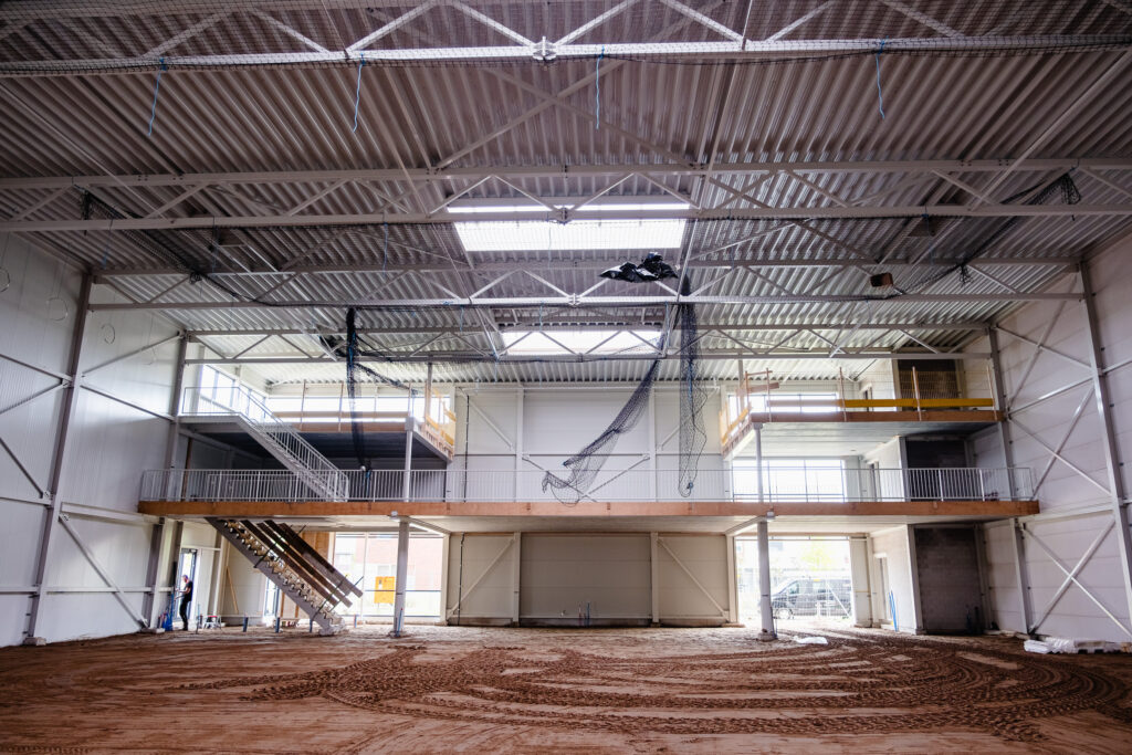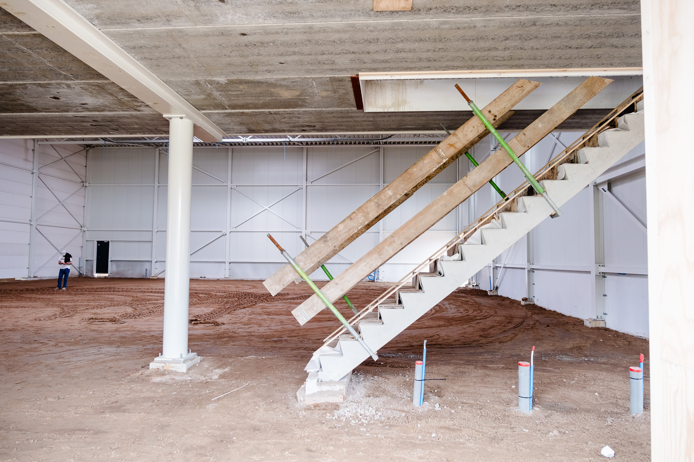 Scheidingswanden: Vooralsnog is de hal één grote ruimte. Op 6 mei plaatsen we de scheidingswanden voor de kleedkamers, de toiletten, het kantoor en de yogaruimte. Ook krijgt de hal dan verlichting.